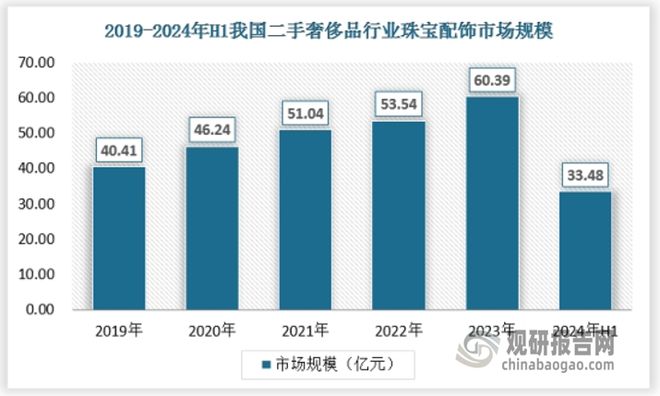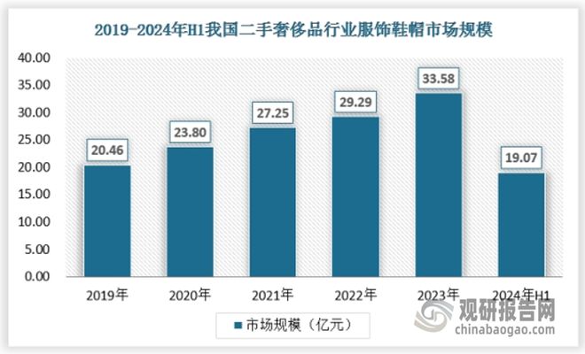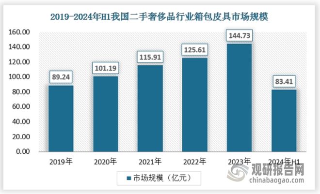 箱包皮具奢侈品的款式多样,流转率和性价比高于其他品类,因此在二手奢侈品市场流行度高,市场份额接近60%,2023年中国二手奢侈品行业箱包皮具市场规模为144.73亿元,2024年上半年为83.41亿元。
