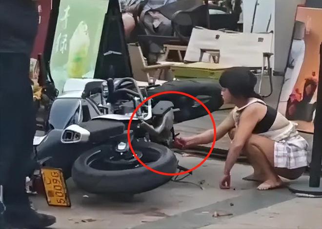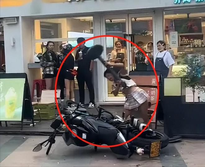 明知打不过身形高大的男车主,她只能将怒气撒在一旁的摩托车上,于是便有了开头的那一幕。