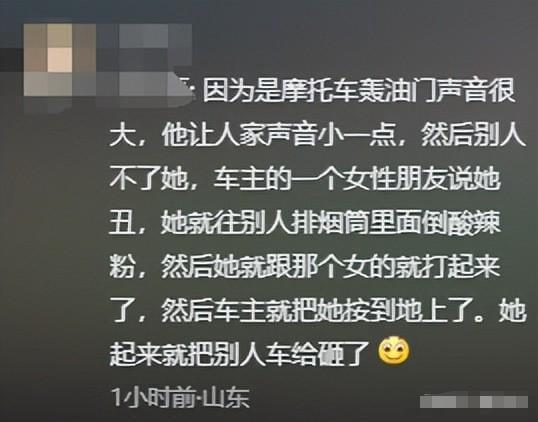 见此情形,精神小妹瞬间怒了,趁车主不注意直接将没吃完的酸辣粉,倒入了摩托车的排气筒里。