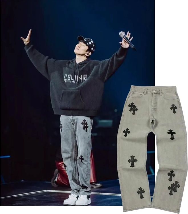接着就是各类牛仔裤。只要上面带有皮革十字架,那就是大写的“理财神器”,十字架越多价格就越高。我一异性朋友去年跟着林俊杰入手了一条经典灰色黑皮款牛仔裤,入手价是7万+,穿到今年年初转手给了二手商,因为成色不错结果依旧是卖了7w+。