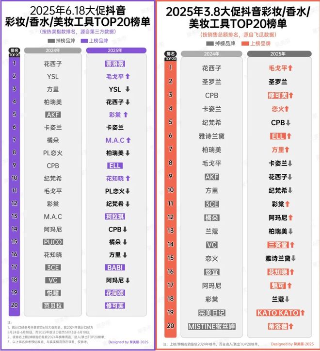 目前来看,阿玛尼在电商平台上的表现稳定。据聚美丽往期报道显示,阿玛尼在2025年抖音618大促中位居彩妆/香水/美妆工具榜第18名,前一年同期则位居同榜单第14名。