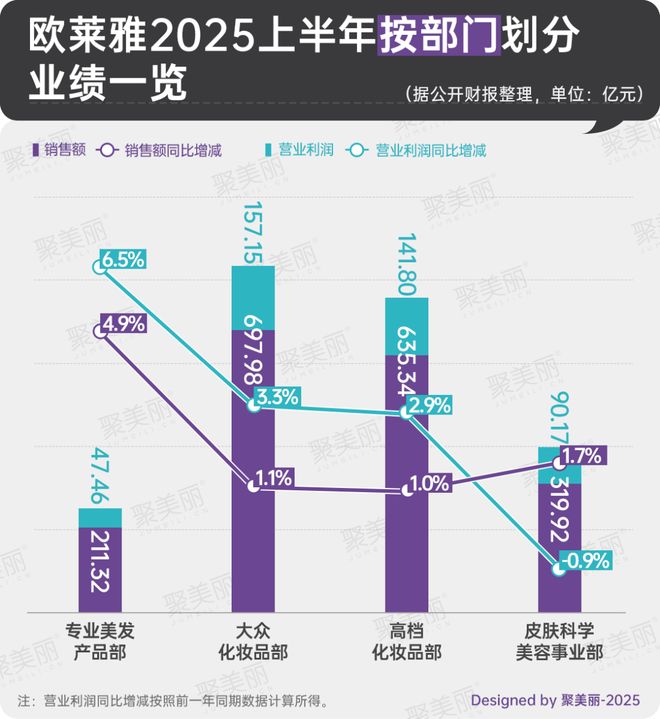 不仅如此,在2025上半年中,欧莱雅皮肤科学美容事业部出现利润下滑,专业美发部、大众化妆品部及高档化妆品部销售额及营业利润的增速,也均不如此前。