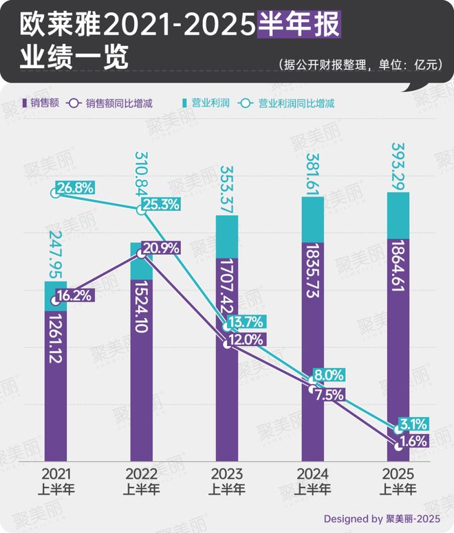 从2021-2025上半年业绩来看,欧莱雅销售额及营业利润虽在持续增长,但增速较此前明显放缓。