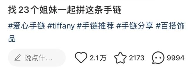 今年8月,一位小红书用户半开玩笑地发帖,“找23个姐妹一起拼这条手链”,配图正是Return to Tiffany系列的爱心手链和项链。