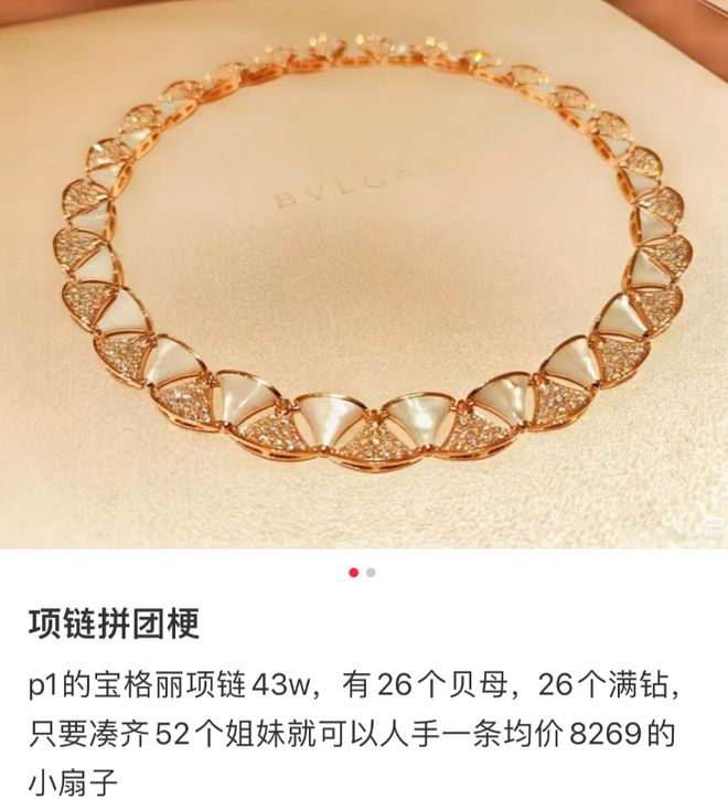项链,镶有26个贝母、26个满钻。如今只要8000多元,就能喜提其中的一面“小扇子”,轻轻松松将原价43万元的项链纳入囊中。