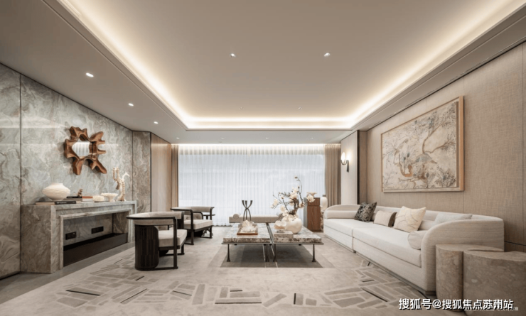 墙面,严选安第斯雪或晓山青珍贵石材,与木饰面、特色定制墙布组合设计;客厅、餐厅、卫生间等区域地面定制石材,赤足走过,温润细腻的触感。