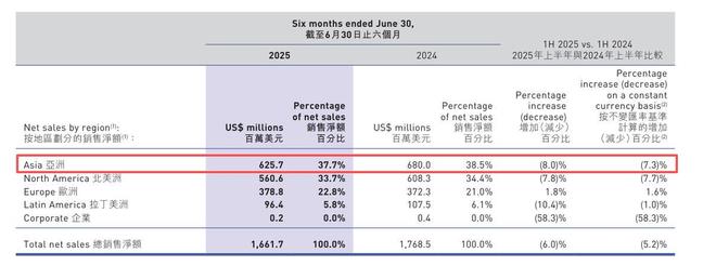 据新秀丽2025年中期报告显示:新秀丽销售净额为16.62亿美元,同比下降6%。亚太地区作为新秀丽的重要市场,销售净额减少了8.0%,是所有区域中下降幅度较大的。