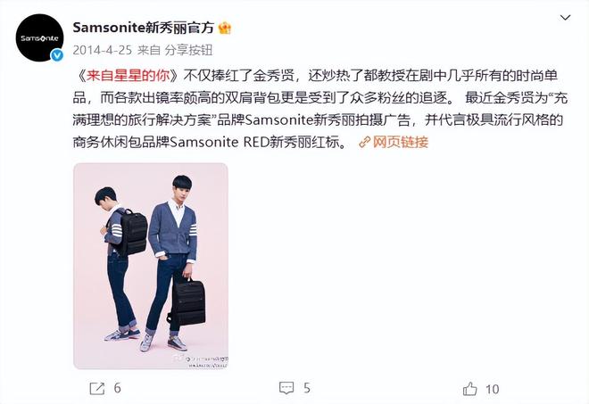 雷军就说过,他家里用的全是新秀丽的箱子。而且就连当时的现象级电视剧《来自星星的你》,里面都出现了新秀丽的同款箱包。