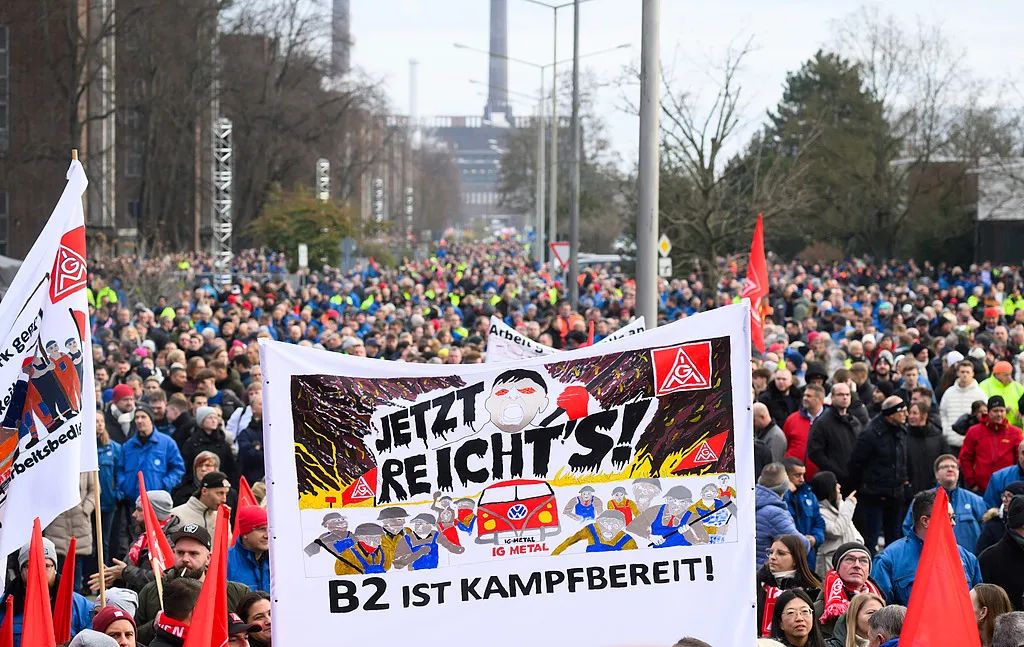 2024年12月2日,约10万名工人在大众汽车集团德国工厂发起罢工,以抗议其在9月公布的一个削减开支计划。这个计划包含关闭至少3家德国工厂,裁员上万人和降薪。