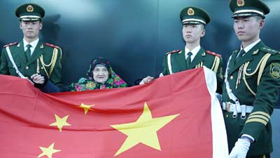 19日一早,冒着寒风,老人在亲友和工作人员的陪同下,瞻仰了毛主席易容,边抹泪边唱歌,不停地念叨,“伟大领袖带领我们过上好日子,他自己却不在了”。登上了天安门城楼之后,眺望广场,老人一下子从轮椅上站了起来,挥舞双臂,这是她激动时喜欢做的动作。