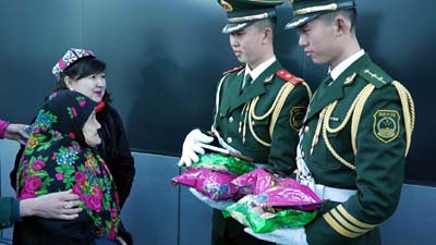 中巴车载着老人驶入武警天安门支队的大院,专门由来自新疆的武警官兵接待了她。古莱外尔老人拿出从塔克拉玛干沙漠取来的“爱心沙”,赠送给武警天安门支队官兵,一同赠送的还有新疆特产大枣、核桃,以及老人带来的鞋垫。武警官兵回赠老奶奶一副在天安门上空飘扬过的国旗,百岁老人与士兵一同打开国旗,激动地挥起双手。她说,要把这面国旗带回村子,“每家挂一天”,跟乡亲们分享自己的故事。