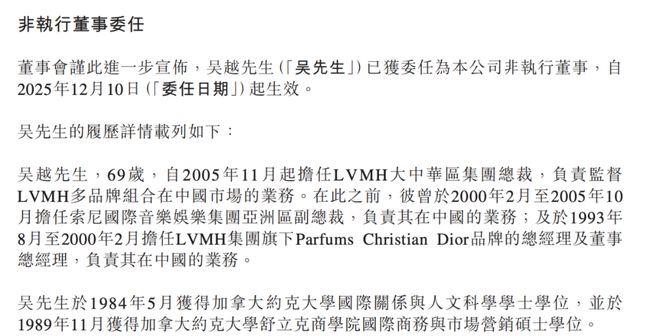“LVMH大中华区总裁加入泡泡玛特董事会”,12月10日,泡泡玛特发布的一则公告引起外界高度关注,公告显示,吴越先生已获委任为公司非执行董事,自2025年12月10日起生效,期限三年。