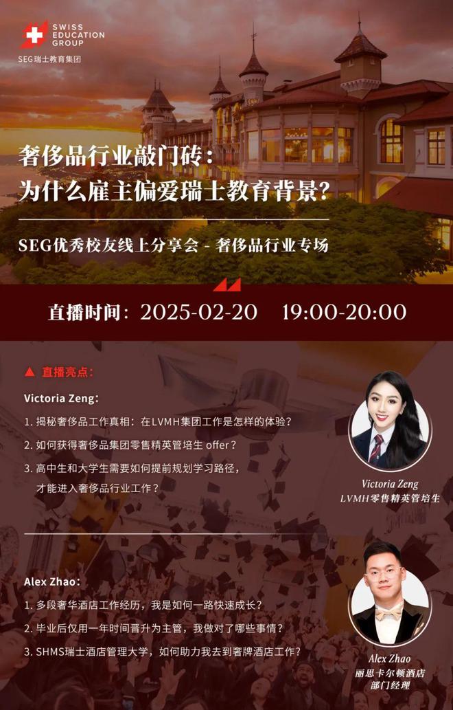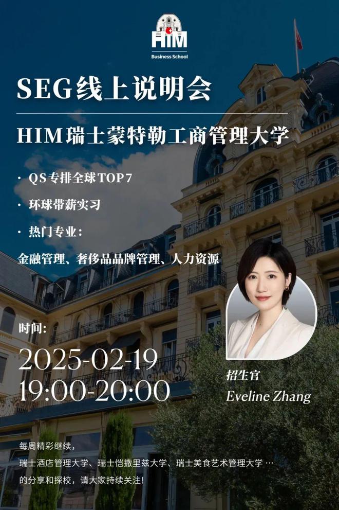 周三、周四,SEG将为同学和家长们带来HIM瑞士蒙特勒工商大学的线上宣讲会和优秀校友线上分享会-奢侈品行业专场。