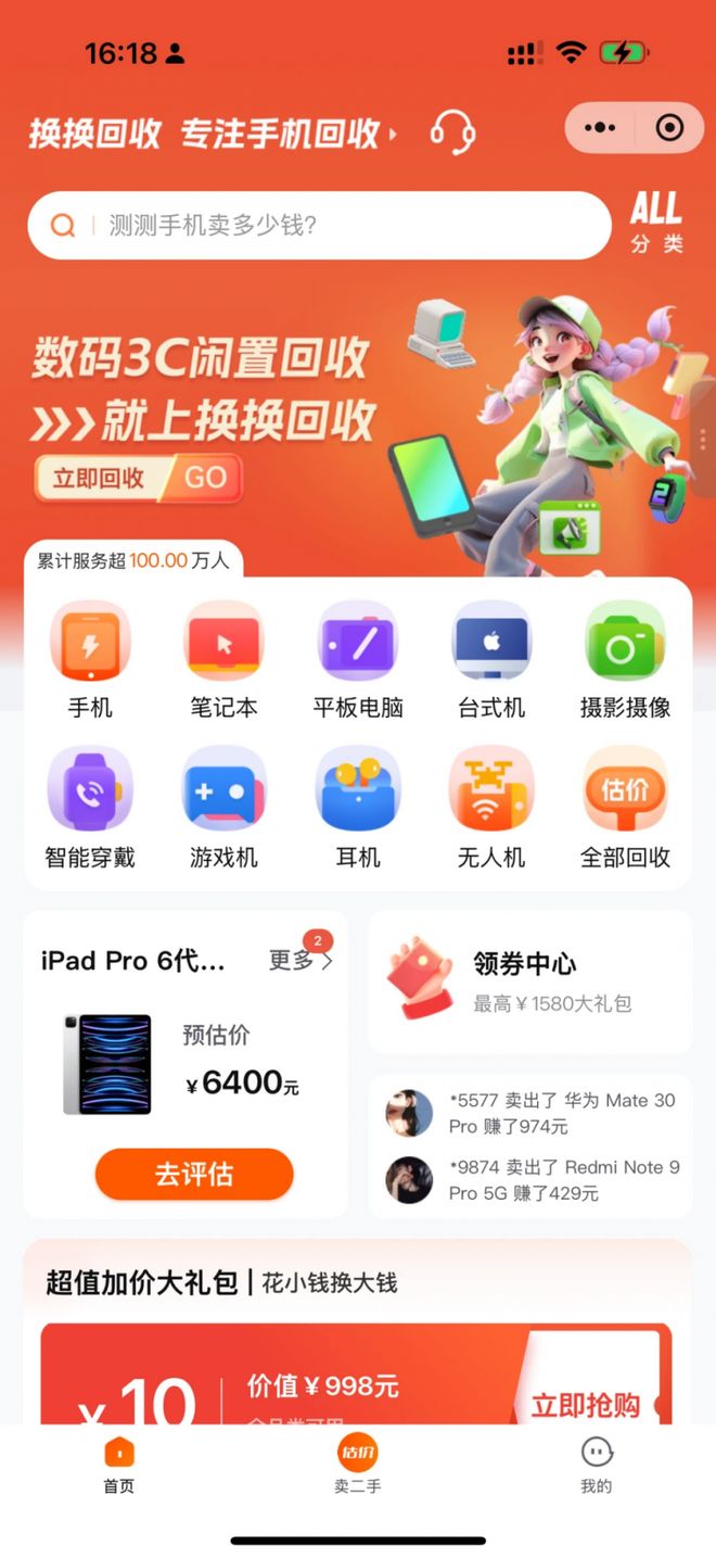 补贴方面,转转叠加国补与平台专项补贴,在旧机回收价基础上额外补贴10%-20%,最高800元,设有报废机专属补贴通道,适配特殊旧品置换。业务覆盖手机、3C数码、二手车回收、笔记本回收、平板回收、包包回收、奢侈品回收、手表回收、黄金回收等30余个品类,形成线上线下一体化服务网络,拥有400家线人的上门服务团队,进一步拓展二手高端消费品等细分领域。关于二手回收模式,转转集团宣布将逐步下线“自由市场”业务,计划于2025年10月31日正式关闭该业务,未来将聚焦于二手“官方验”业务模式。深耕行业十余年,转转以标准化服务重构二手交易生态,既为用户提供高性价比的闲置好物,也推动了闲置资源的循环利用,成为国内循环经济领域的标杆企业。其适用场景主要为3C数码置换、报废机及故障机回收。
