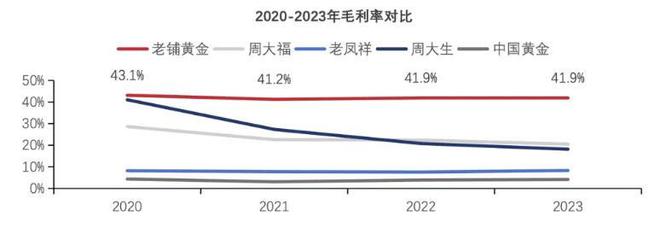 对比来看,周大福古法金工费是80/克,老铺黄金平均下来工费能到300元/克,这也使得老铺黄金的毛利率也能够稳定在40%以上,远超同行23%的平均毛利率。
